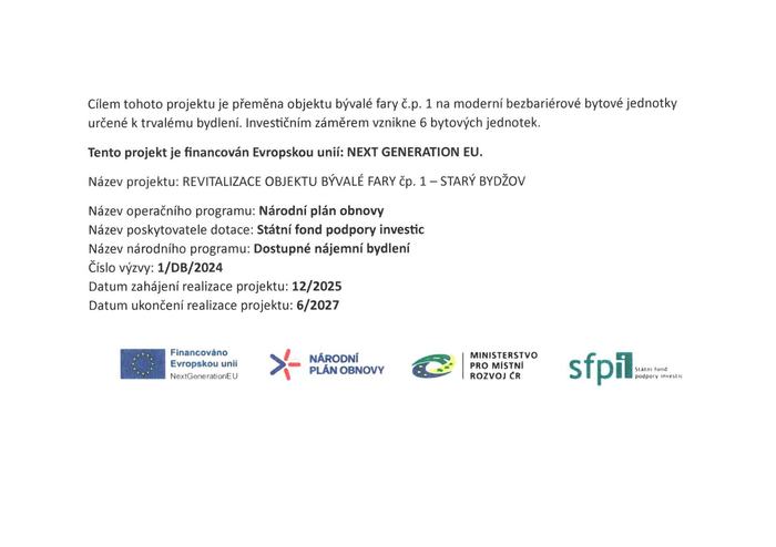 Úvod > Obecní úřad > Projekty > REVITALIZACE OBJEKTU BÝVALÉ FARY čp.1 - STARÝ BYDŽOV